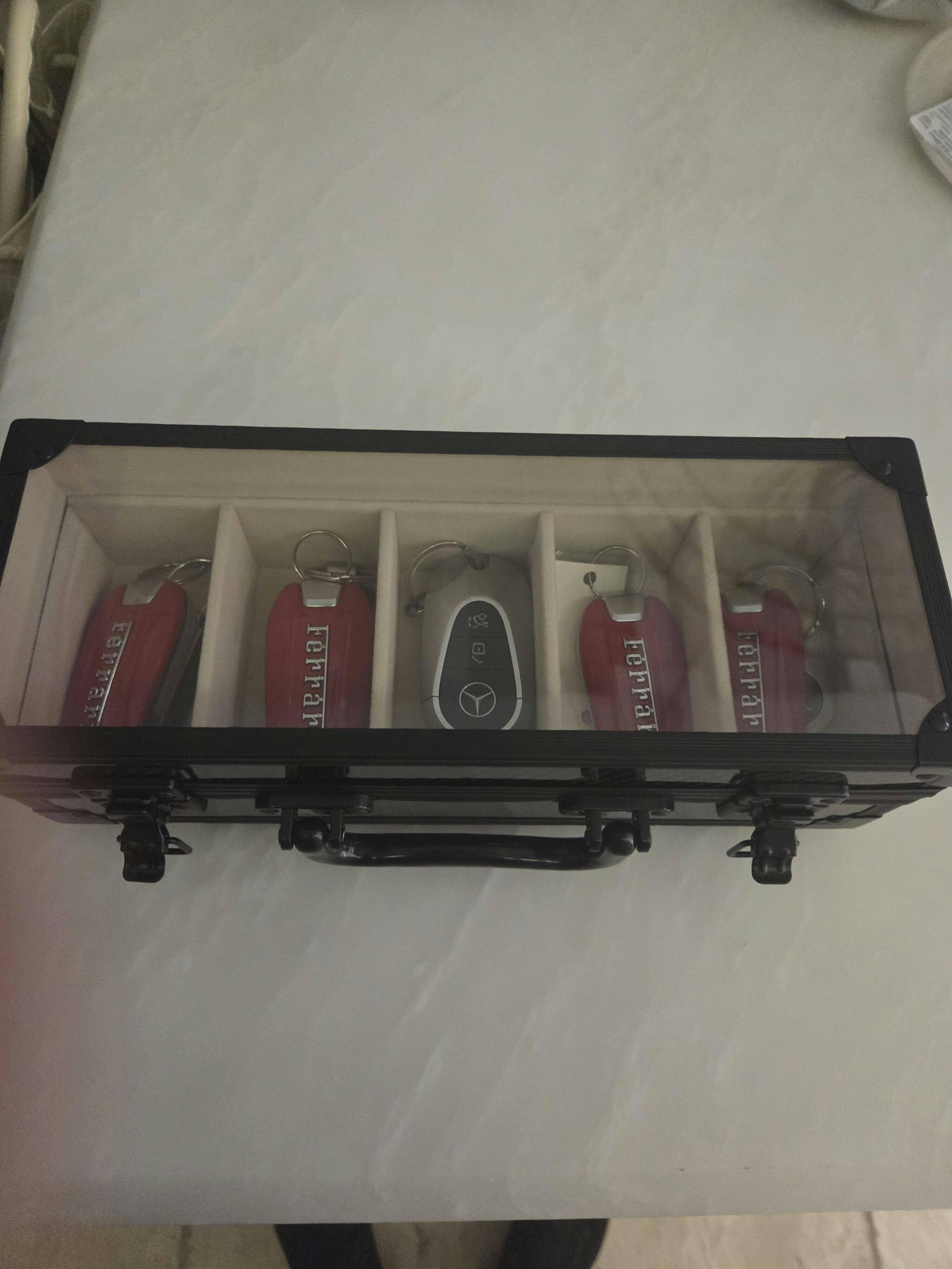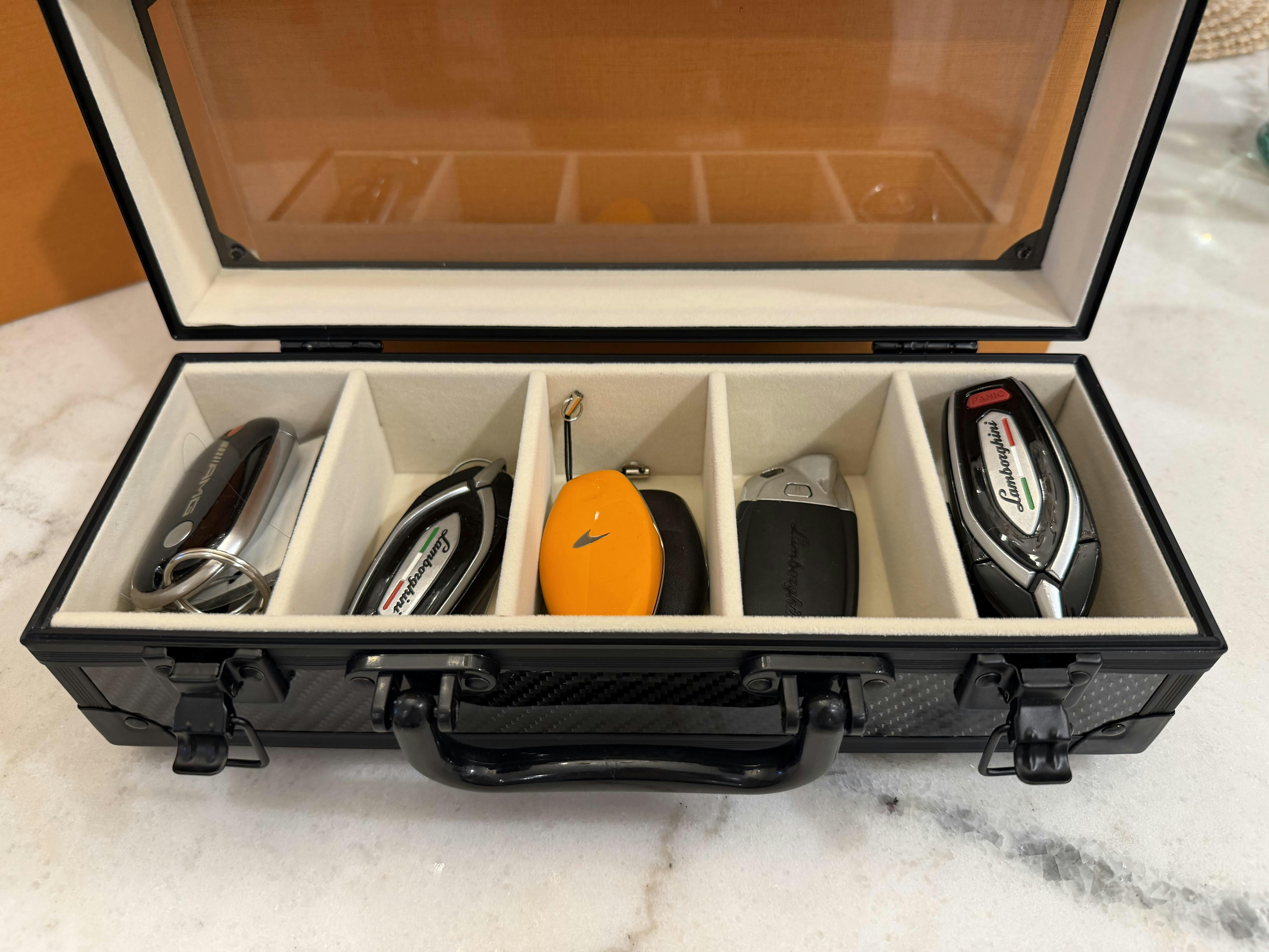 The Carbon-Haus Motorcasè is a real 3K carbon fiber key box with a clear acrylic lid. Holds 5 keys. Solid, planted, built to last. Inside, a cream leatherette lining — inspired by the elegance of a Rolex watch case — holds each key in luxury.